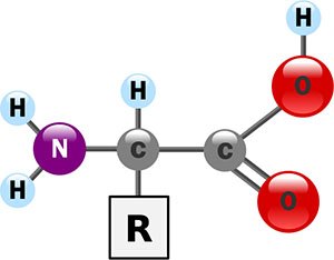 Les peptides et polypeptides sont des polymères composés d'acides aminés. Les acides alpha-aminés sont composés d'un groupe carboxyle COOH et d'un groupe amine NH, liés entre eux par un atome de carbone qui porte également un atome d'hydrogène et une chaîne latérale R. C'est cette chaîne latérale qui la fonction de l'acide aminé.