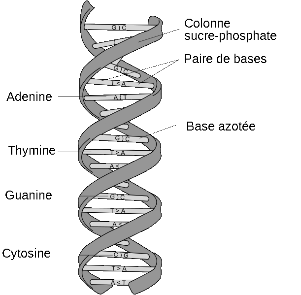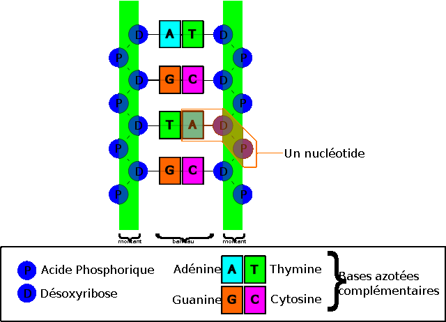 Les nucléotides sont composés de bases azotées, de sucres (les desoxyriboses) et de phosphate. Il existe quatre types de bases azotés, séparés en deux groupes, les pyrimidines (thymine et cytosine), et les purines (adénine et guanine). La liaison entre les deux brins de la double hélice se fait toujours à travers des liaisons A-T et G-C, par des ponts hydrogènes. La thymine et l'adénine sont dites bases complémentaires, de même que la guanine et la cytosine.