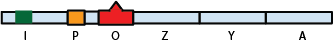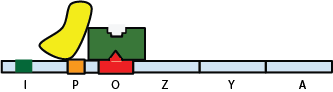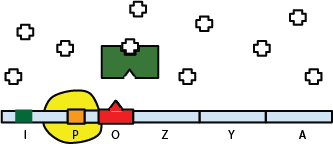 Le gène I permet la synthèse d'une protéine, le répresseur lac (représenté en vert sur le schéma ci-dessous). Cette protéine se lie à l'ADN au niveau de l'opérateur O. Au moment de la transcription des gènes lacZ, lacY et lacA, la présence du répresseur lac bloque la transcription ADN-ARN en empêchant la fixation sur l'ADN du complexe (en jaune) qui assure cette transcription.