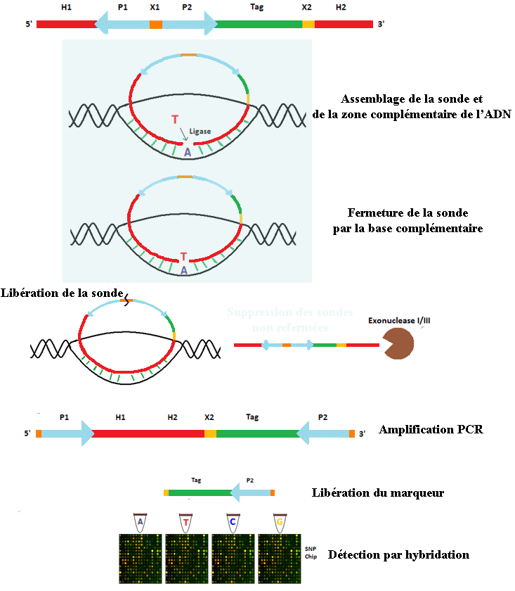Lorsque la séquence de la sonde était exactement complémentaire de la séquence de l'ADN, la liaison était totale et dépliait la boucle, libérant le marqueur fluorescent. Ces techniques ne permettaient de tester qu'un seul allèle à la fois. Les méthodes MIP, plus complexes, permettent de tester simultanément plusieurs allèles, et ce sur de nombreux sites simultanément