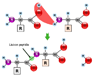 Les acides aminés polymérisent en libérant une molécule d'eau suivant la réaction chimique:
