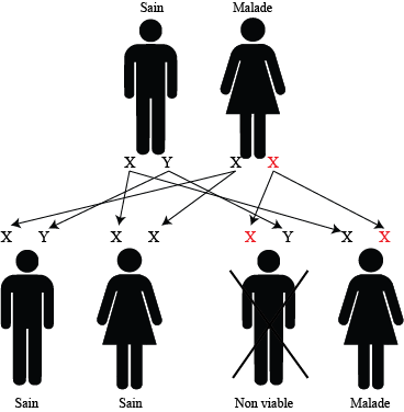 On remarquera que, pour une anomalie génétique récessive non létale liée à l'X, si la probabilité de trouver dans une population un individu mâle atteint est de p, la probabilité de trouver un individu femelle atteint ne sera que de p2. Pour les anomalies récessives plus graves, les individus mâles ne se reproduisant généralement pas, il n'existe jamais d'individu de sexe féminin atteint. Les maladies récessives liées à l'X se rencontrent donc essentiellement chez les hommes.