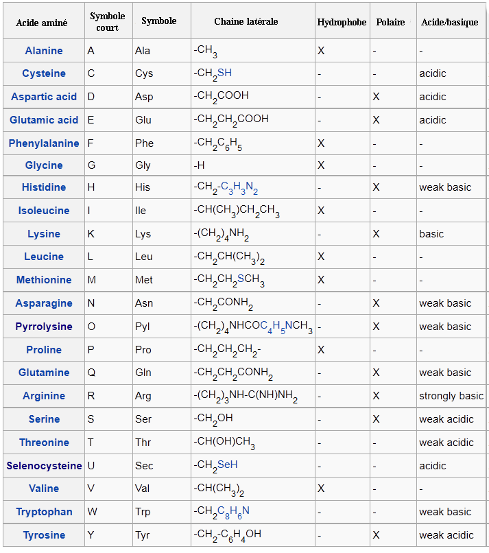 Les 22 acides aminés sont les suivants: