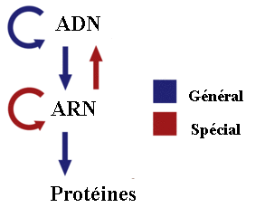 Après avoir vu comment l'ADN se duplique, permettant ainsi la duplication des cellules lors de la mitose et la reproduction lors de la méiose, il nous reste à comprendre comment une cellule est susceptible d'exprimer le code génétique pour fabriquer, entre autres choses, les protéines dont notre corps à besoin. L'opération qui va de l'ADN à la fabrication des protéines comprend plusieurs étapes que nous allons rapidement examiner.