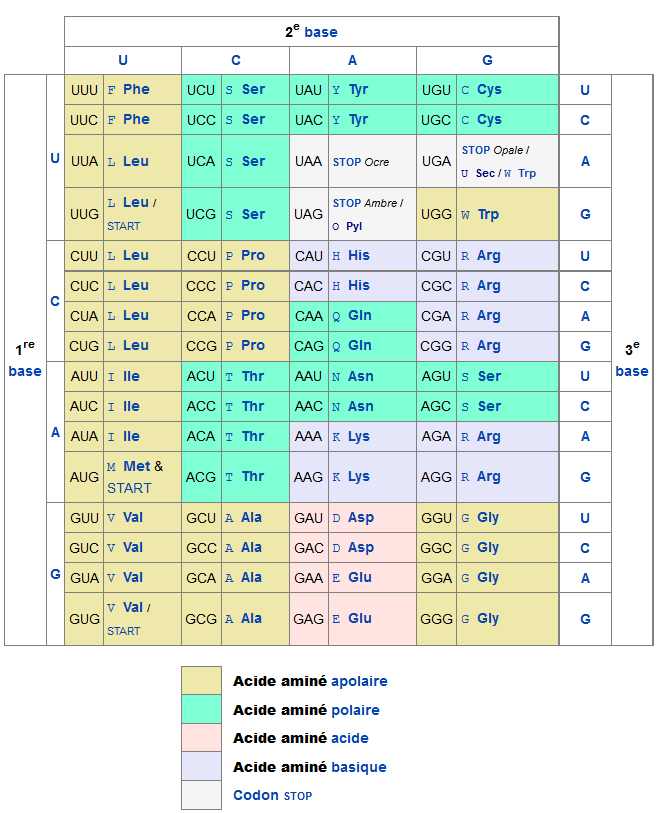 Le code génétique contient exactement 43=64 codons différents. Cependant ce code est dégénéré. Des séquences différentes peuvent en effet coder le même acide aminé. Cette dégénérescence se trouve essentiellement au niveau de la 3ème base du codon. Ainsi, les codons CUU, CUC, CUA et CUG codent tous la leucine. Il existe trois codons particuliers (UUG, AUG et GUG) qui codent respectivement la leucine, la méthionine et la valine mais sont aussi les codons qui se trouvent généralement systématiquement en début de séquence codante (codons START). 3 codons ne codent (en général) aucun acide aminé: ce sont les codons UAA (codon STOP Ocre), le codon UAG (codon STOP Ambre) et le codon UGA (codon STOP Opale). Lorsque le processus de traduction rencontre un de ces codons, la traduction s'arrête. Le code génétique standard représenté ci-dessus ne permet de coder que 20 acides aminés, et non 22. Les deux derniers acides aminés sont codés (sous certaines conditions très particulières) pour la pyrrolysine par le codon STOP UAG et pour la sélénocystéine par le codon STOP UGA.