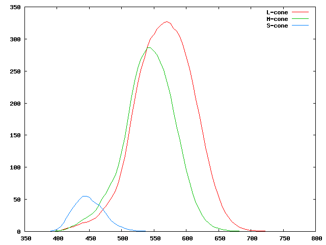 Sensibilité spectrale moyenne des trois types de cône