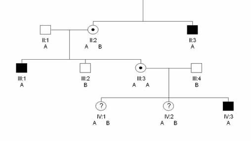 Supposons maintenant que II:2 ait des enfants avec II:1, individu mâle non malade mais néanmoins porteur d'un SNP A (ce qui est parfaitement possible, le SNP A n'étant corrélé avec l'hémophilie que dans l'autre branche familiale). En génération III, on sait de façon certaine que les individus mâles porteurs d'un SNP B seront obligatoirement sains (car il s'agit forcément du B associé au "gène sain" de la mère, à condition bien sûr que la recombinaison n'ait pas "cassé" le chromosome entre le marqueur et le gène, mais cela est extrêmement improbable s'ils sont proches), que les mâles SNP A seront malades (car il s'agira là aussi du SNP-A de la mère associé au gène muté) que les femmes SNP A-A seront forcément porteurs sains de la maladie et les femmes SNP A-B seront homozygotes saines. En revanche, on constate que sur l'individu III:3, il est devenu impossible de distinguer le gène sain du gène muté puisque les deux sont marqués par un SNP A. Ainsi, en génération IV, il serait impossible de faire un diagnostic prénatal sur IV:3 qui peut aussi bien être malade que sain, avec dans les deux cas un SNP A, pas plus que l'on ne peut savoir si IV:1 et IV:2 sont homozygotes sains ou hétérozygotes.