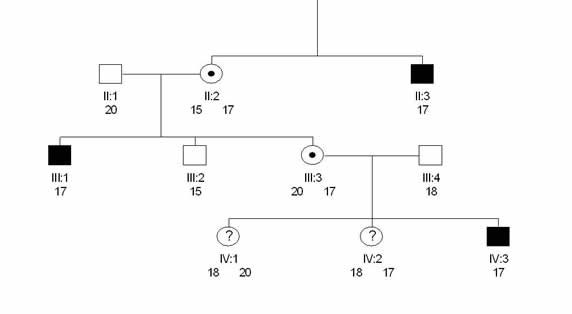 En génération II, l'individu II:3 est bien porteur d'un gène muté, repéré par les 17 répétitions du STR, l'individu II:2 est hétérozygote porteur sain avec un gène portant le marqueur 17 et un autre gène portant un marqueur 15. En épousant un individu portant un marqueur 20, nous avons en génération III un individu mâle (malade) portant le marqueur 17, un mâle sain portant le marqueur 15, et une femme porteur sain avec un marqueur 17 et un marqueur 20. Lorsque ce porteur sain épouse un individu sain portant un marqueur 18, nous sommes maintenant capables e savoir qu'en génération IV, un mâle porteur du marqueur 17 sera malade (IV:3), que l'individu IV:2 est hétérozygote porteur sain et que IV:1 est totalement sain (pas de marqueur 17). On peut ainsi lever totalement les ambiguïtés qui existaient avec les SNP, car les marqueurs STR possèdent beaucoup plus d'allèles, et il est donc moins probable de rencontrer deux individus portant le même allèle associé à des phénotypes différents.