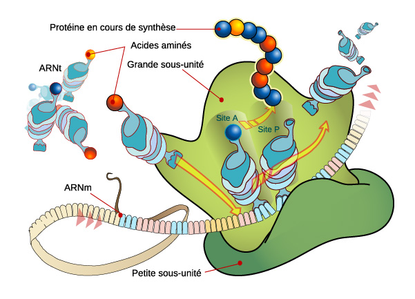 L'opération se déroule grâce aux ribosomes. Les ribosomes sont constitués de deux sous-unités, appelées sous-unité L (pour large, ou grande sous-unité), et sous-unité S (pour small, ou petite sous-unité). Les ribosomes sont composés d'acides aminés et d'ARN, appelé ARNr, ou ARN ribosomique.