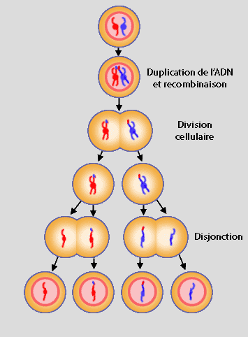 La méiose est la division cellulaire qui permet la reproduction sexuée. Partant d'une cellule à 2n chromosomes (nombre normal de chromosomes), elle aboutit à 4 cellules ne contenant que n chromosomes, soit 4 gamètes (ovules chez la femme, spermatozoïde chez l'homme).