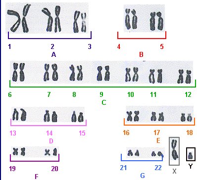 Comme on peut le voir sur un caryotype, les chromosomes humains sont très différents en taille et en structure. Les chromosomes 1 et 2 sont très grands, les chromosomes 21, 22 ou Y sont beaucoup plus petits. Un dernier (mais important) rappel: la représentation de l'ADN sous forme de chromosomes est faite à un stade très particulier de la vie de la cellule, juste après la duplication de l'ADN. Il y a donc deux fois plus d'ADN (c'est la raison de l'existence des chromatides soeurs) dans la cellule à ce moment là qu'en "temps normal" de la vie cellulaire.