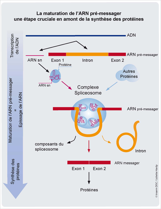 Après la transcription, l'ARN pré-messager fabriqué est une suite de paires de bases. Mais cette suite contient deux types de séquences: les exons qui seront effectivement traduits, et les introns, qui doivent être éliminés de la séquence. L'opération qui élimine les introns s'appelle l'épissage. Une fois l'épissage effectué, l'ARN pré-messager est devenu l'ARN messager, ou ARNm.