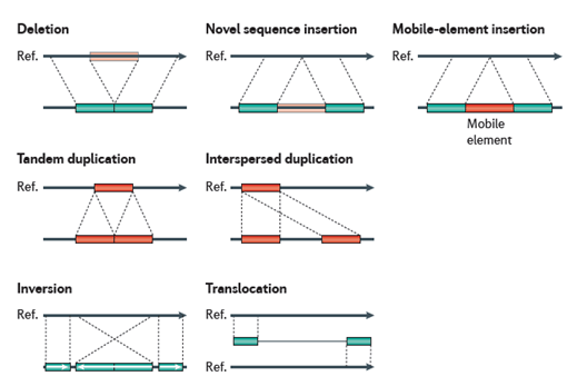 Les CNV ne sont pas les seules variations structurelles du génome. Il en existe bien d'autres (voir ci-dessous) qui semblent toutes avoir une importance. L'étude des variations structurelles est un des champs en cours d'explorations dans le cadre de la compréhension du génome.