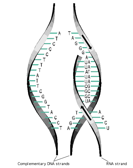 La transcription consiste donc à séparer temporairement les deux brins de la molécule d'ADN pour créer une copie complémentaire du brin matrice sous la forme d'un brin d'ARN.