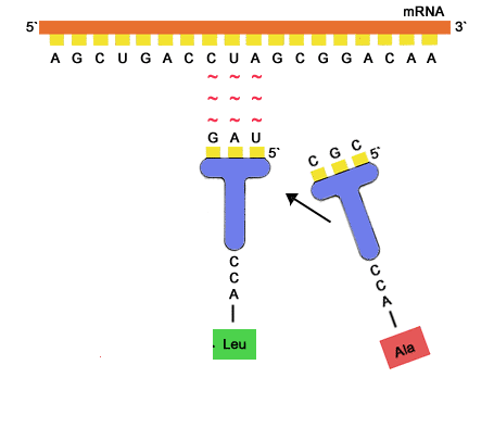 Les ARNt ont une structure dite en "feuille de trèfle", formés de 4 bras. Sur la partie orange se trouve un acide aminé, et sur la partie noire une série de 3 bases azotées appelées anti-codon. Pour une séquence de 3 bases donnée, on trouve toujours le même acide aminé. Le reste de la structure de l'ARNt est identique. Cette séquence de 3 bases est exactement complémentaire d'une séquence de 3 bases se trouvant sur l'ARNm. Pour une séquence de 3 bases données sur l'ARNm, l'ARNt spécifique de cet ARNm va se fixer sur l'ARNm au sein de l'unité S du ribosome.